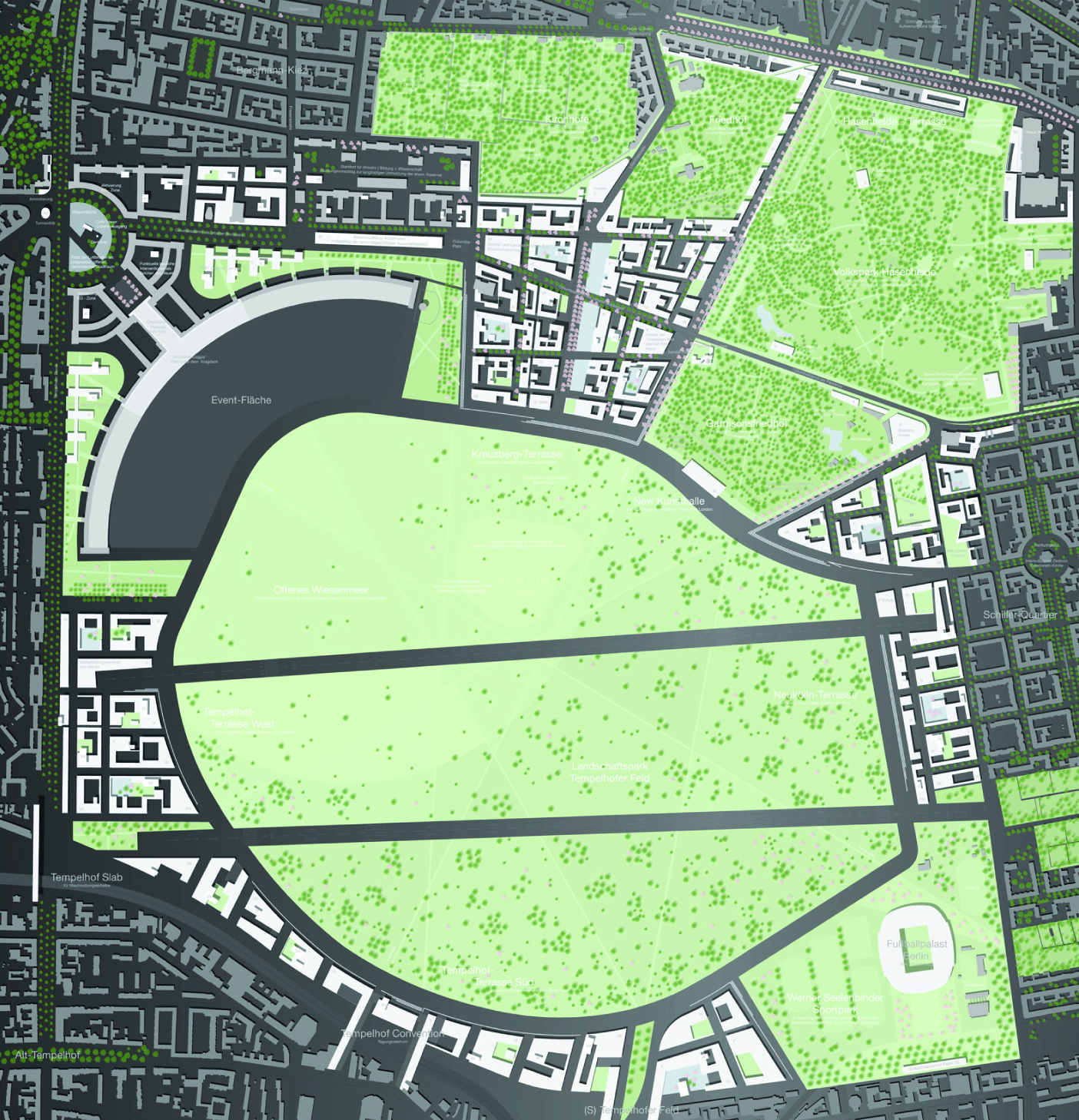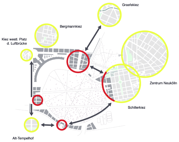 Ziel des zweistufigen, durch die Senatsverwaltung für Stadtentwicklung ausgerufenen Ideenwettbewerbs war die Aktivierung und schrittweise Entwicklung des stillgelegten Flughafenareals zu einem lebendigen, integrierten urbanen Quartier. Die historische Bedeutung des Ortes erhält besondere Aufmerksamkeit. In unserem Entwurf rahmen Terrassen das ehemalige Flugfeld mit einer einfachen und dennoch starken städtebaulichen Geste und schaffen Orte für temporäre und permanente Nutzungen sowie Begegnungspunkte für unterschiedliche demografische Gruppen. Nutzungskonzepte werden zusammen mit den Akteur_innen vor Ort entwickelt, der Städtebau ermöglicht neue Standards der Energieeffizienz. Der Entwurf schafft einen starken Rahmen für das langfristige Zusammenwachsen der Bevölkerungsgruppen und Baustrukturen der benachbarten Stadtteile Neukölln, Kreuzberg und Tempelhof. Weitere Informationen